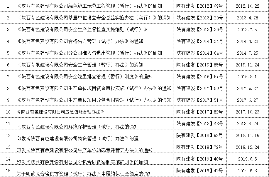 三、公司管理體系制度不斷完善健全。制定了《陜西有色建設有限公司安全生產管理手冊》《陜西有色建設有限公司文明施工、綠色施工管理手冊》《陜西有色建設有限公司VIS企業視覺識別系統》。