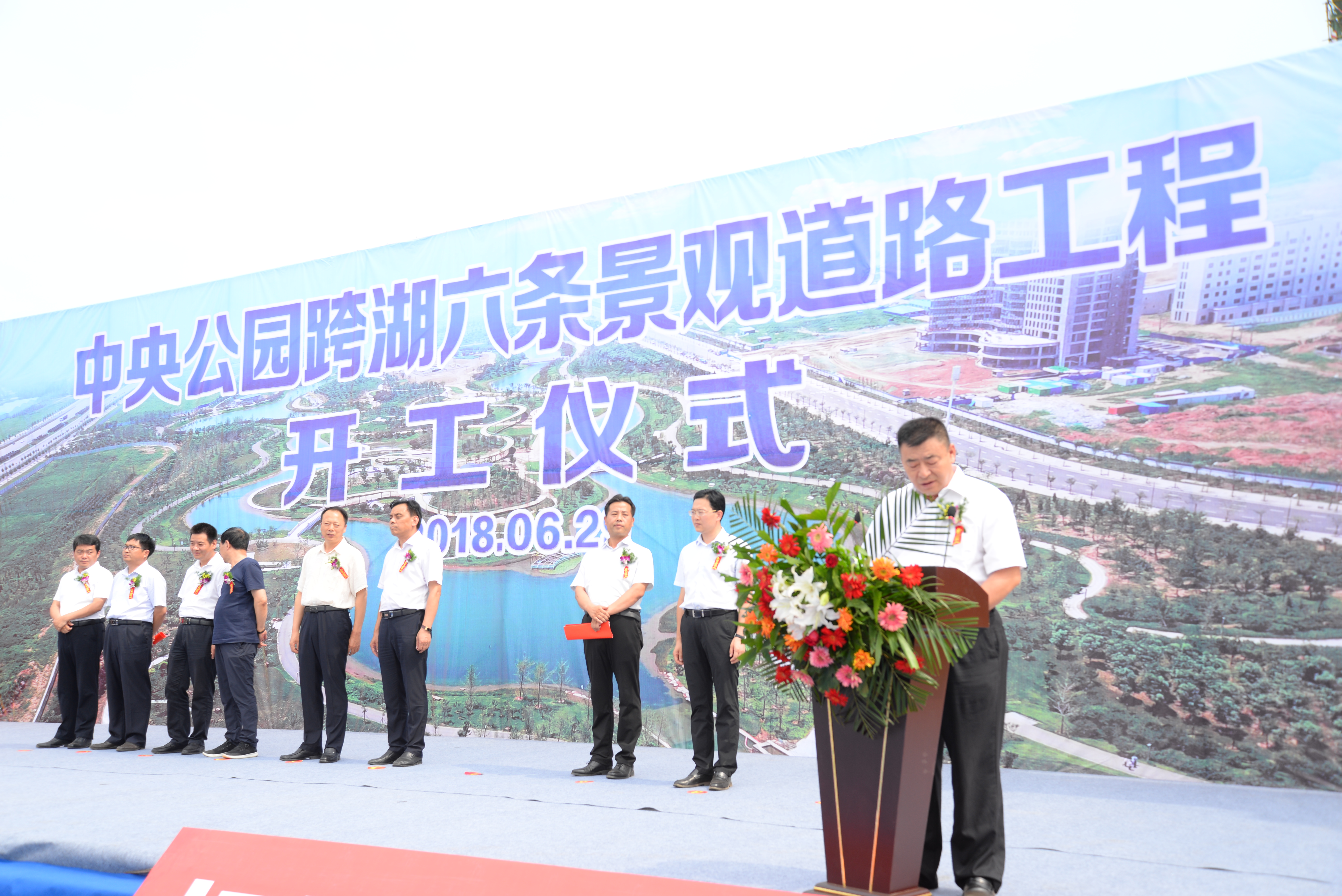 隨著張留華主任宣布“開工”,鞭炮和禮炮齊鳴,中央公園跨湖六條景觀道路工程開工儀式順利結束。